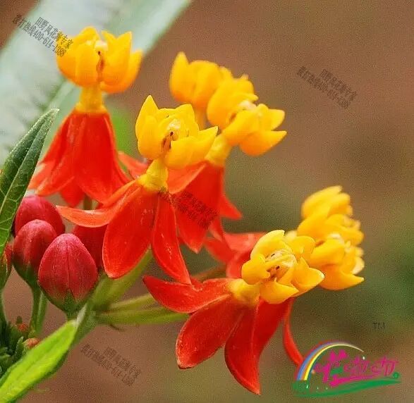 形态:多年生宿根性亚灌木状草本植物,茎基部半木质化,直立性,株高30~180公分具乳汁,全株有毒。单叶对生,披针形或矩圆形披针形;伞形花序顶生或腋生,花冠轮状五深裂,红色,副花冠黄色。