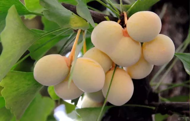 ▲银杏:种皮为白色,形态似杏。(银杏树又称公孙树,是因为其生长较慢,寿命极长,自然条件下从栽种到结银杏果要二十多年,四十年后才能大量结果,“公种而孙得食”。)