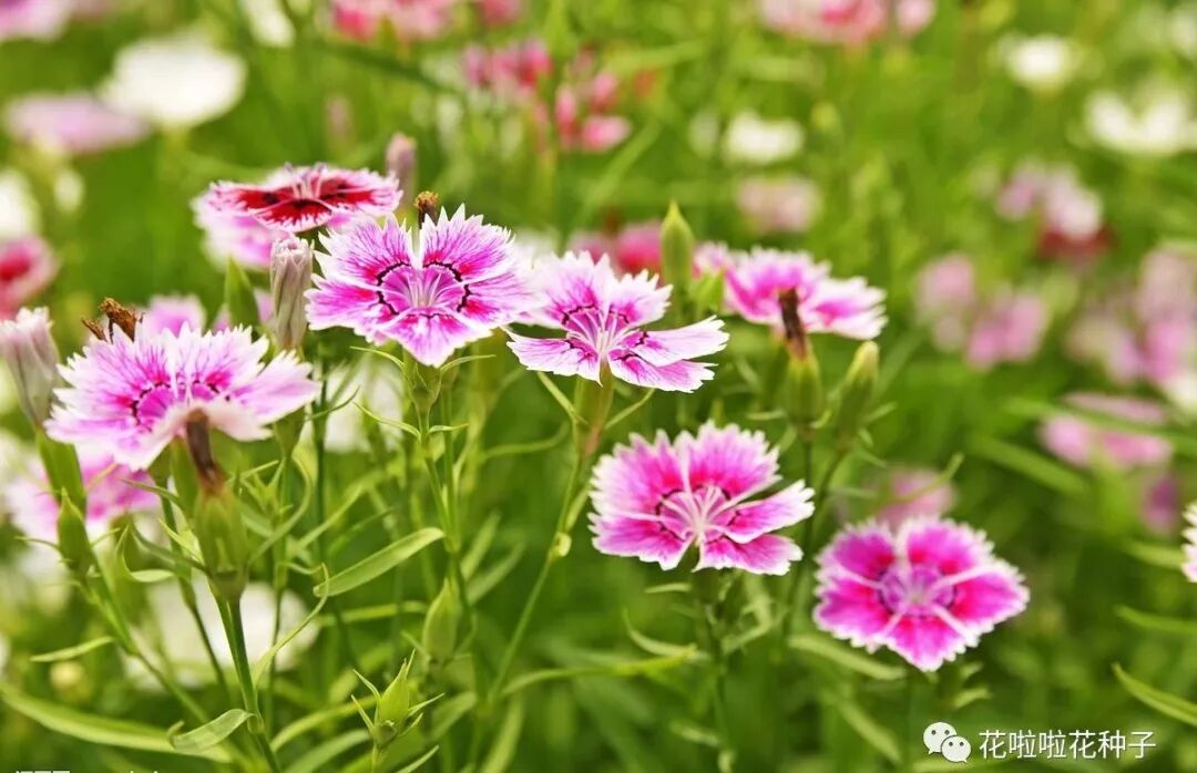 五彩石竹,别名:须苞石竹、美国石竹、十样锦,(学名:Dianthus barbatus L.)属中央种子目,石竹科多年生草本,高30-60厘米,叶片披针形,花瓣通常红紫色,有白点斑纹,蒴果卵状长圆形,花果期5-10月。植物耐寒而不耐酷暑,石竹可以全草或根入药。具清热利尿、破血通经之功效。同属植物300余种。原产中国东北,华北、长江流域及东南亚地区。