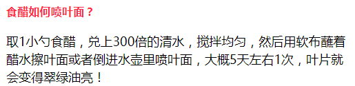 一些观叶花卉如:绿萝、君子兰、橡皮树等,经常出现叶子发黄、灰扑扑等情况,非常难看!这时候,就可以用一点点醋擦擦,瞬间油亮旺盛,打蜡似的!