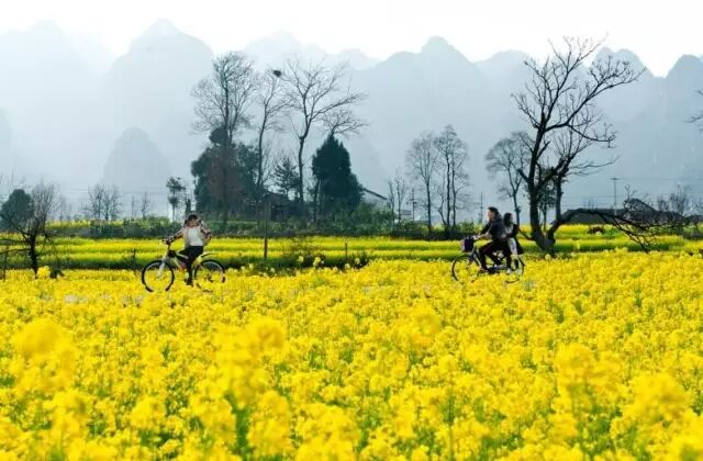 骑着自行车行驶在万峰林的乡间小路上,道路一侧,树枝还未抽芽,光秃秃的枝桠在风中发出簌簌声响;道路另一侧,却已然有大片油菜花顶寒盛放,将这和熙的春日装扮得更美丽。