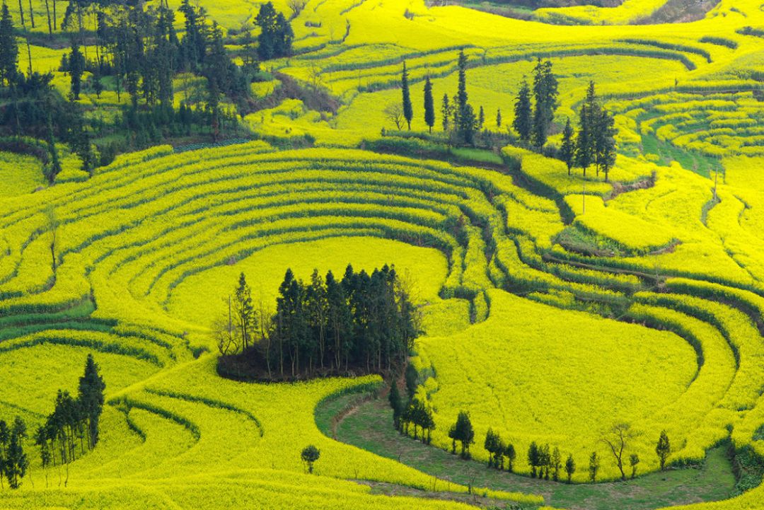 站在高处远远望去,仿佛上天涂抹的色块,色彩斑斓炫目、艳丽饱满,有着优美的线条,又勾画得如此浓墨重彩。
